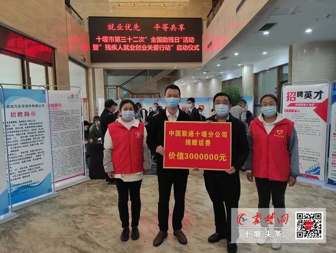 中国联通十堰分公司、中国移动十堰分公司、民盟十堰市委、湖北仁美口腔医疗管理有限公司、湖北悦步医疗科技有限公司、十堰乡情茶叶开发有限公司、竹溪三元米业有限公司、湖北爱婴贝美贸易有限公司、湖北道和汽车文化传播有限公司、湖北金财联信信息科技有限公司、十堰康福盲人按摩中心、恩德莱(湖北)健康科技有限公司等12家爱心单位,捐赠话费、物资、资金折合629.33万元,为发展我市残疾人事业捐款相助、捐资帮扶。